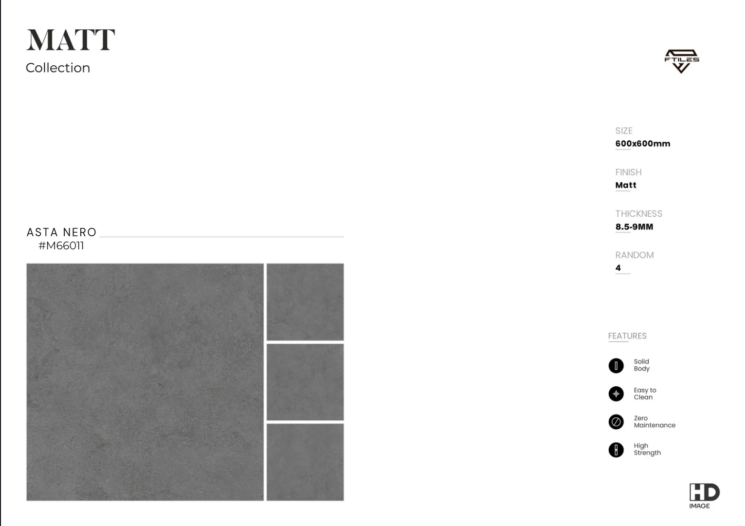 ASTA NERO – M66011 là mẫu gạch Matt (mờ, chống trơn) cao cấp, kích thước 600x600mm, nổi bật với gam đen huyền bí kết hợp vân đá marble tự nhiên mạnh mẽ. Sản phẩm mang đến không gian vẻ đẹp sang trọng – cá tính – hiện đại, đồng thời tăng độ an toàn nhờ bề mặt mờ chống trơn.