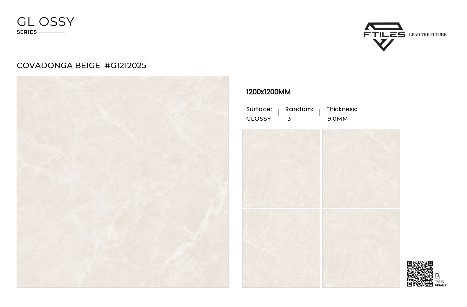 DESERT PEARL – G1212007 thuộc bộ sưu tập 1200x1200mm Glossy PGVT cao cấp của FTILES. Mẫu gạch khổ lớn này mang gam pearl beige sáng ấm, gợi cảm hứng từ sắc thái cát sa mạc kết hợp ánh ngọc trai, bề mặt bóng kính sang trọng cùng vân đá marble mềm mại, tạo nên không gian ấm áp – thanh lịch – đẳng cấp.