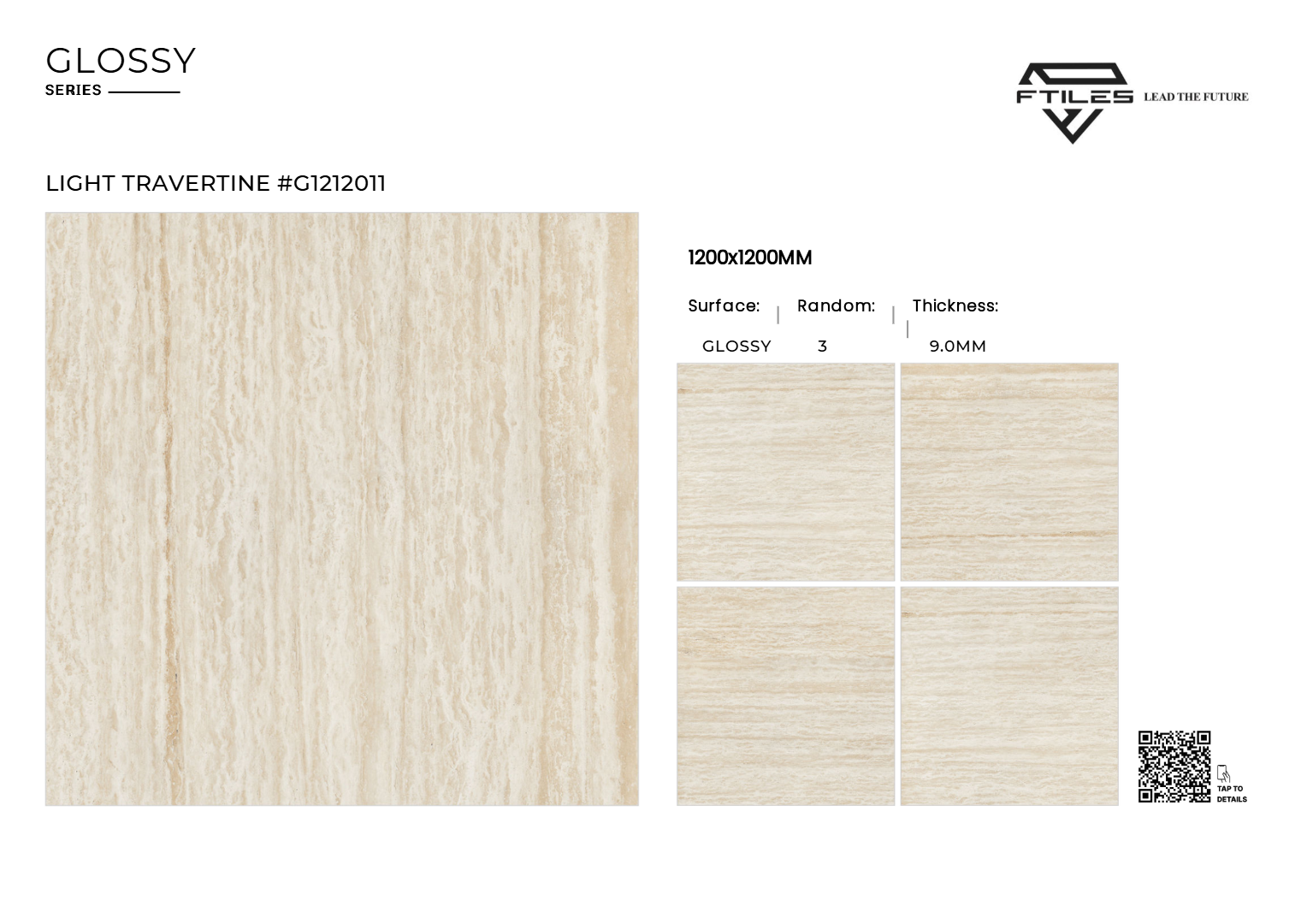 LIGHT TRAVERTINE – G1212011 thuộc bộ sưu tập 1200x1200mm Glossy PGVT cao cấp của FTILES. Đây là mẫu gạch khổ lớn lấy cảm hứng từ đá Travertine tự nhiên, với gam màu sáng thanh lịch, bề mặt bóng kính sang trọng và vân đá đặc trưng dạng sọc mảnh. Sản phẩm mang đến không gian tối giản – thanh lịch – sang trọng.