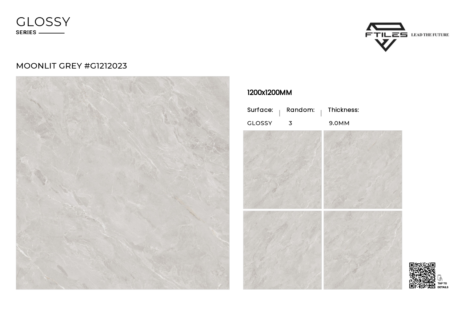 MOONLIT GREY – G1212023 thuộc bộ sưu tập 1200x1200mm Glossy PGVT cao cấp của FTILES. Lấy cảm hứng từ sắc xám dịu nhẹ dưới ánh trăng, mẫu gạch mang gam grey trung tính thanh lịch, bề mặt bóng kính sang trọng cùng vân đá marble mềm mại, giúp không gian trở nên hiện đại – tinh tế – sang trọng.