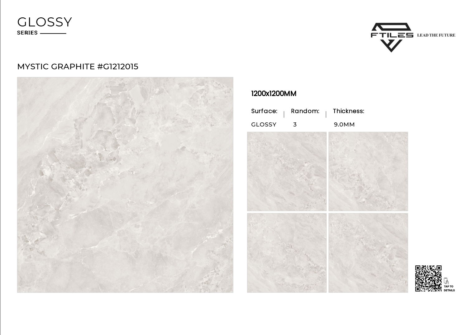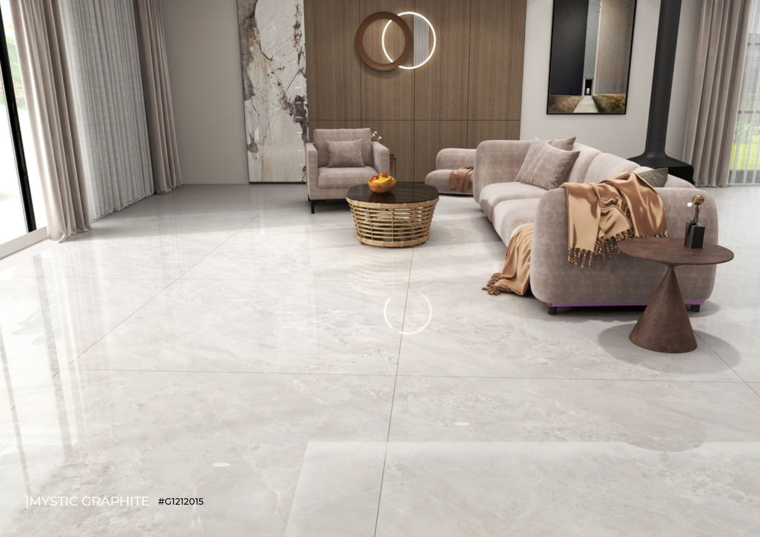 MYSTIC GRAPHITE – G1212015 thuộc bộ sưu tập 1200x1200mm Glossy PGVT cao cấp của FTILES. Đây là mẫu gạch khổ lớn với gam xám than đậm (graphite), bề mặt bóng kính hiện đại, kết hợp vân đá mạnh mẽ, mang đến không gian quyền lực – sang trọng – đẳng cấp.