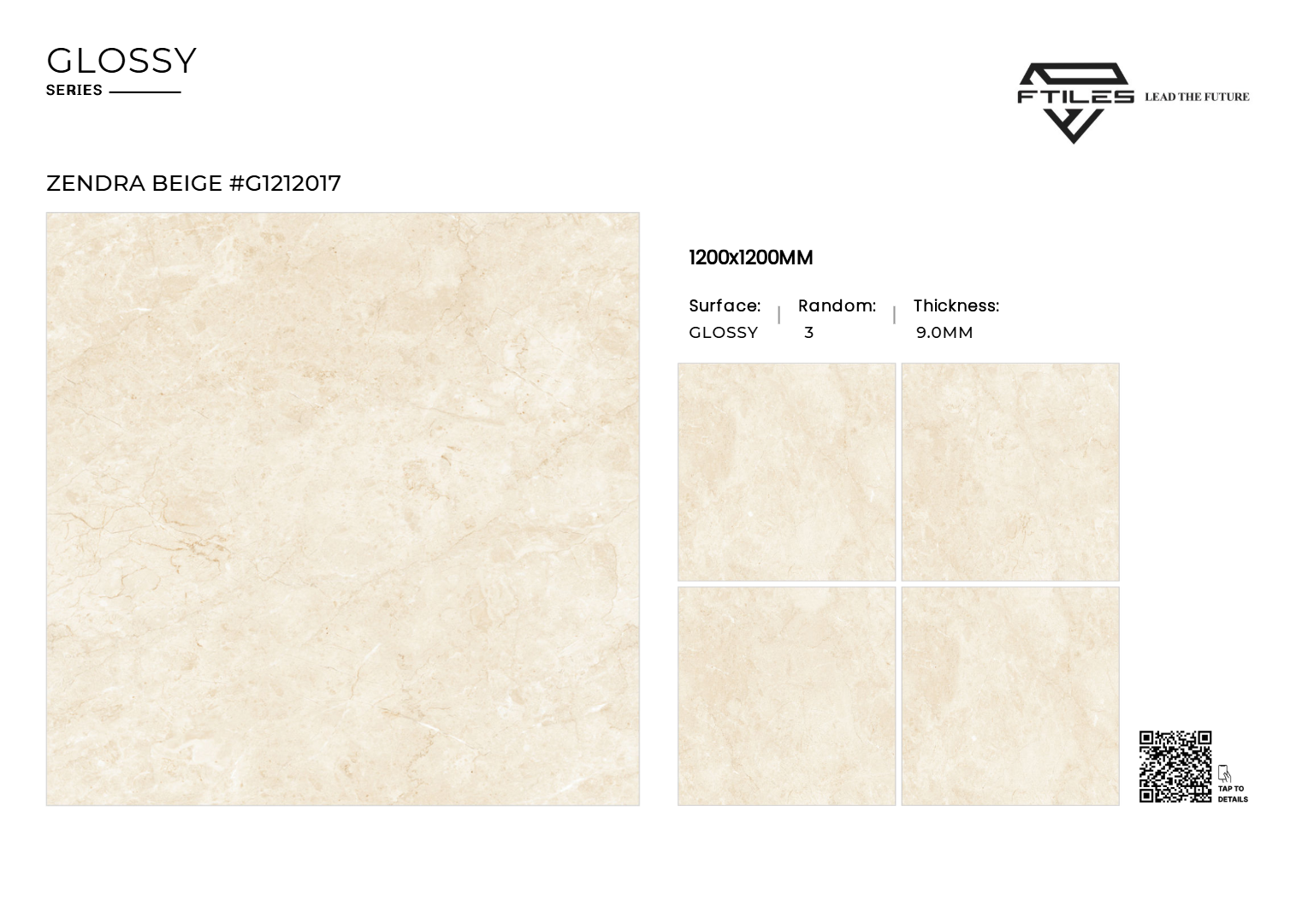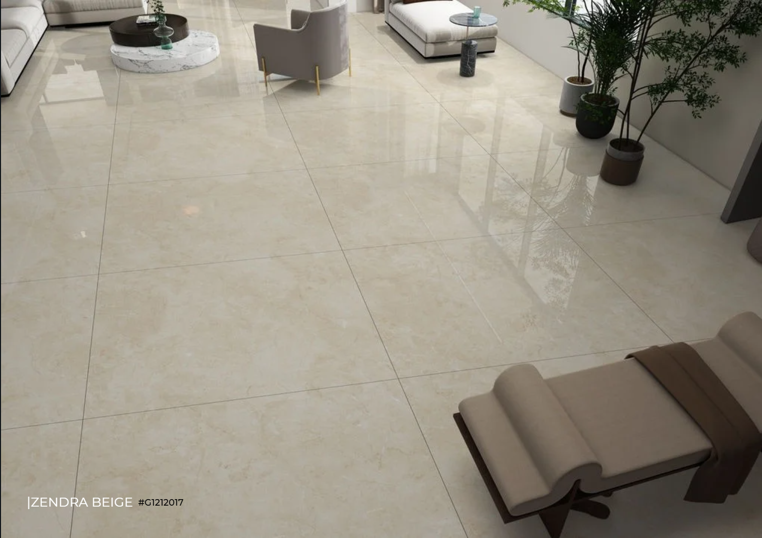 ZENDRA BEIGE – G1212017 thuộc bộ sưu tập 1200x1200mm Glossy PGVT cao cấp của FTILES. Đây là mẫu gạch khổ lớn với gam beige sáng hiện đại, kết hợp vân marble tinh tế và bề mặt bóng kính sang trọng, mang lại cảm giác thoáng rộng – thanh lịch – đẳng cấp cho không gian.