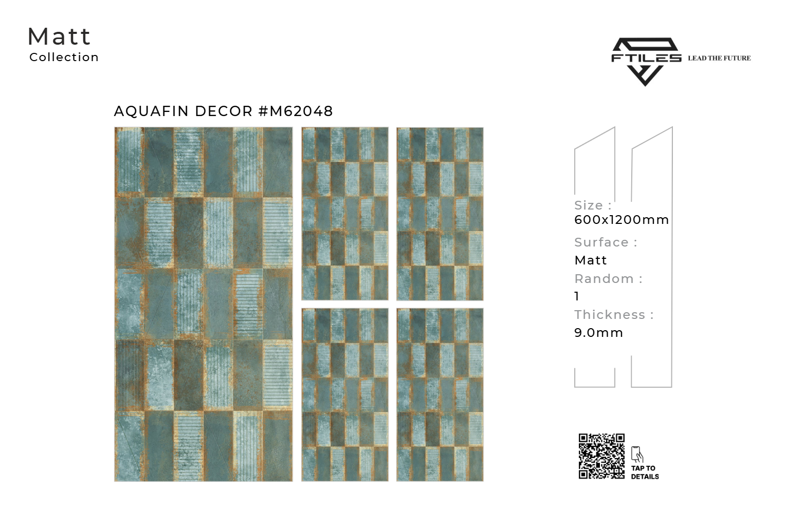 AQUAFIN DECOR – M62048 không chỉ là gạch trang trí, mà còn là giải pháp nghệ thuật tạo điểm nhấn không gian. Với họa tiết stone độc đáo, gam màu xám trung tính, bề mặt Matt chống trơn và độ bền vượt trội, sản phẩm mang lại sự cân bằng hoàn hảo giữa thẩm mỹ – công năng – sáng tạo, lý tưởng cho công trình dân dụng và thương mại cao cấp.