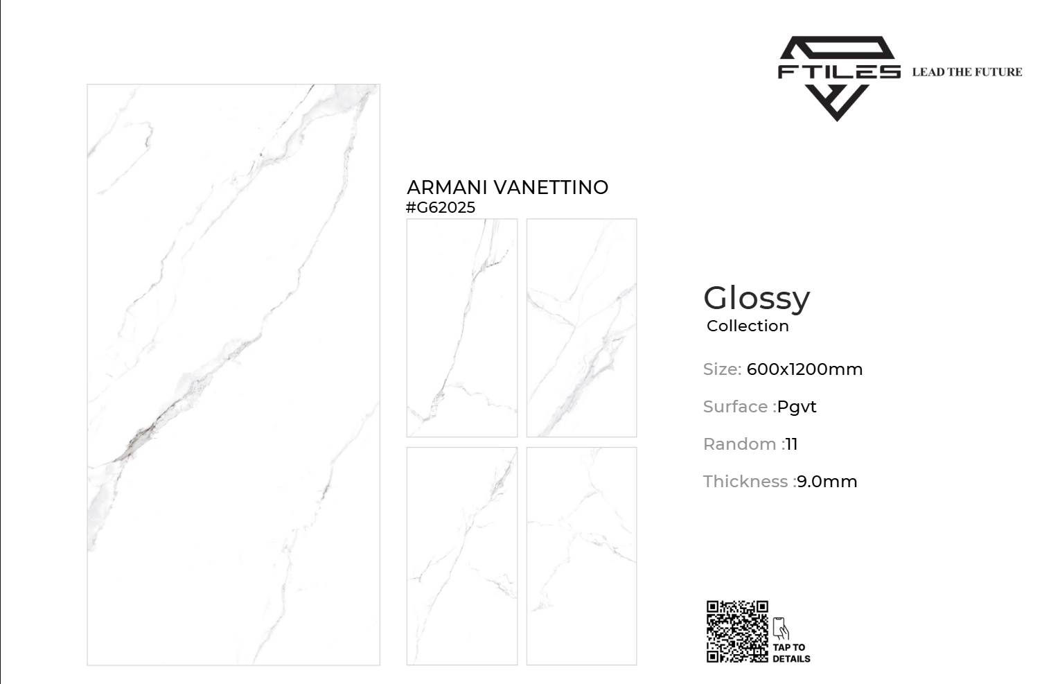 ARMANI VANETTINO – G62025 thuộc bộ sưu tập Glossy PGVT cao cấp của FTILES, kích thước 600x1200mm, với gam nâu Armani đậm sang trọng. Bề mặt bóng kính hiện đại làm nổi bật vân đá tự nhiên, tạo chiều sâu và độ phản chiếu đẳng cấp cho không gian.