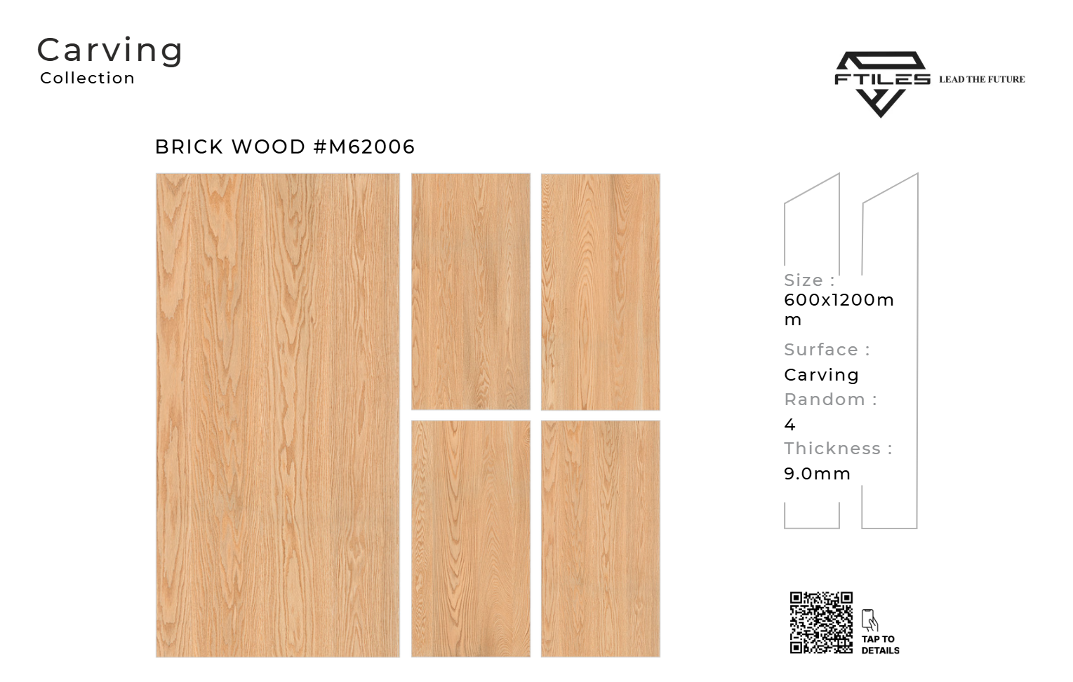 BRICK WOOD – M62006 không chỉ là gạch lát/ốp, mà còn là giải pháp thay thế gỗ tự nhiên bền vững & thẩm mỹ. Với hiệu ứng vân gỗ chân thực, gam nâu gỗ ấm áp, bề mặt Matt chống trơn và độ bền vượt trội, sản phẩm mang lại sự cân bằng hoàn hảo giữa tính thẩm mỹ – công năng – an toàn, lý tưởng cho công trình dân dụng và thương mại.