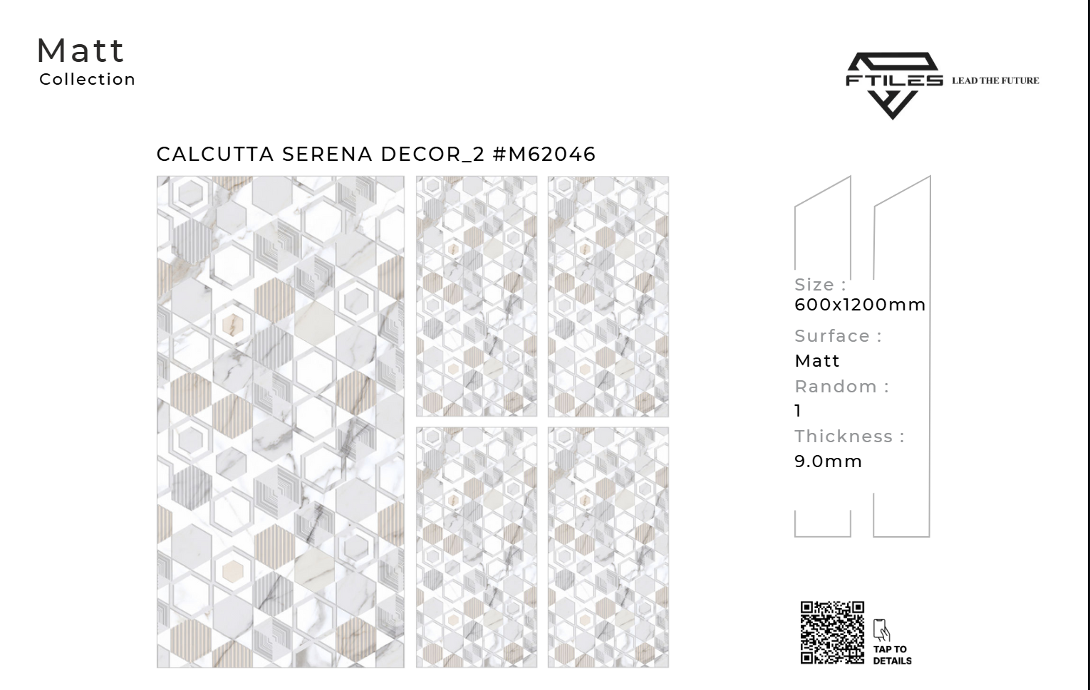 CALCUTTA SERENA DECOR_2 – M62046 không chỉ là gạch trang trí, mà còn là tác phẩm nghệ thuật trong thiết kế nội thất. Với cảm hứng từ đá Calacatta, họa tiết decor tinh tế, bề mặt Matt chống trơn và độ bền vượt trội, sản phẩm mang lại sự cân bằng giữa thẩm mỹ – công năng – sáng tạo, lý tưởng cho công trình dân dụng và thương mại cao cấp.