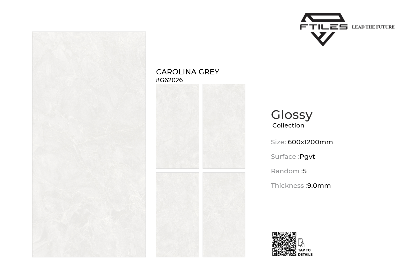 CAROLINA GREY – G62026 thuộc bộ sưu tập Glossy PGVT cao cấp của FTILES, kích thước 600x1200mm. Sản phẩm sở hữu gam xám trung tính hiện đại, bề mặt bóng kính sang trọng, kết hợp vân marble nhẹ nhàng, mang lại không gian thanh lịch, tinh tế và rộng thoáng.