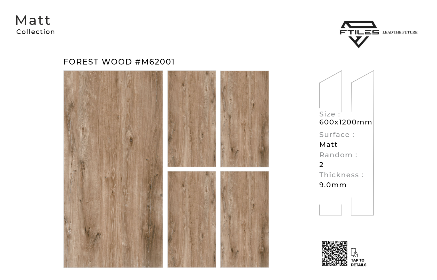 FOREST WOOD – M62001 không chỉ là gạch lát/ốp, mà còn là giải pháp thay thế gỗ tự nhiên bền vững & thẩm mỹ. Với hiệu ứng vân gỗ chân thực, gam màu nâu gỗ rừng ấm áp, bề mặt Matt chống trơn và độ bền vượt trội, sản phẩm mang đến sự cân bằng giữa thẩm mỹ – công năng – an toàn, lý tưởng cho công trình dân dụng và thương mại cao cấp.