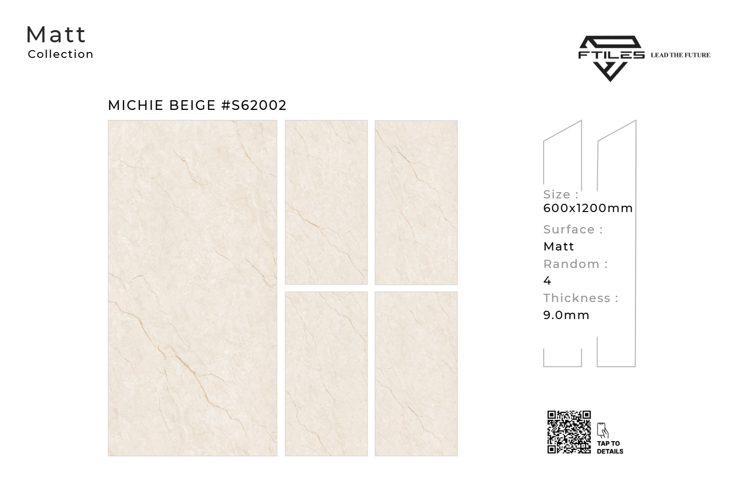 MICHIE BEIGE – S62002 không chỉ là gạch lát/ốp, mà còn là giải pháp kiến tạo không gian sang trọng & đẳng cấp. Với gam beige trang nhã, vân marble tự nhiên tinh tế, bề mặt PGVT bóng kính và độ bền vượt trội, sản phẩm mang lại sự cân bằng hoàn hảo giữa thẩm mỹ – công năng – đẳng cấp, lý tưởng cho công trình dân dụng và thương mại cao cấp.
