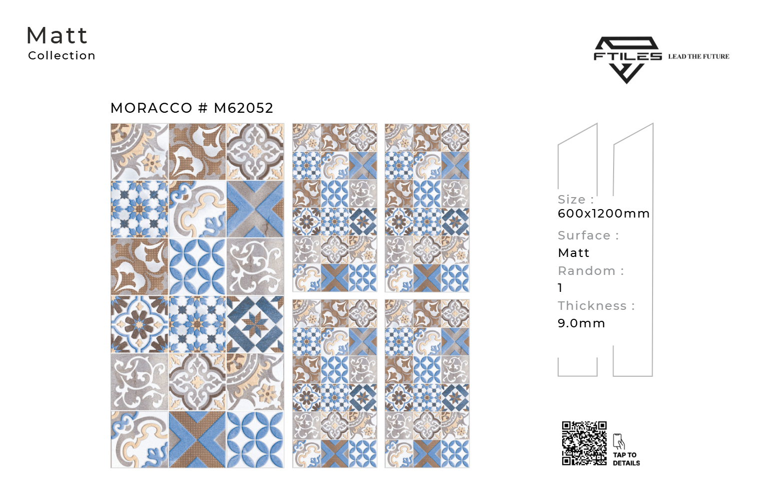 MORACCO – M62052 không chỉ là gạch ốp/lát, mà còn là tác phẩm nghệ thuật ứng dụng trong không gian sống. Với hoa văn Moroccan độc đáo, bề mặt Matt chống trơn và độ bền vượt trội, sản phẩm mang lại sự kết hợp hài hòa giữa thẩm mỹ – công năng – nghệ thuật, lý tưởng cho các công trình dân dụng và thương mại cao cấp.