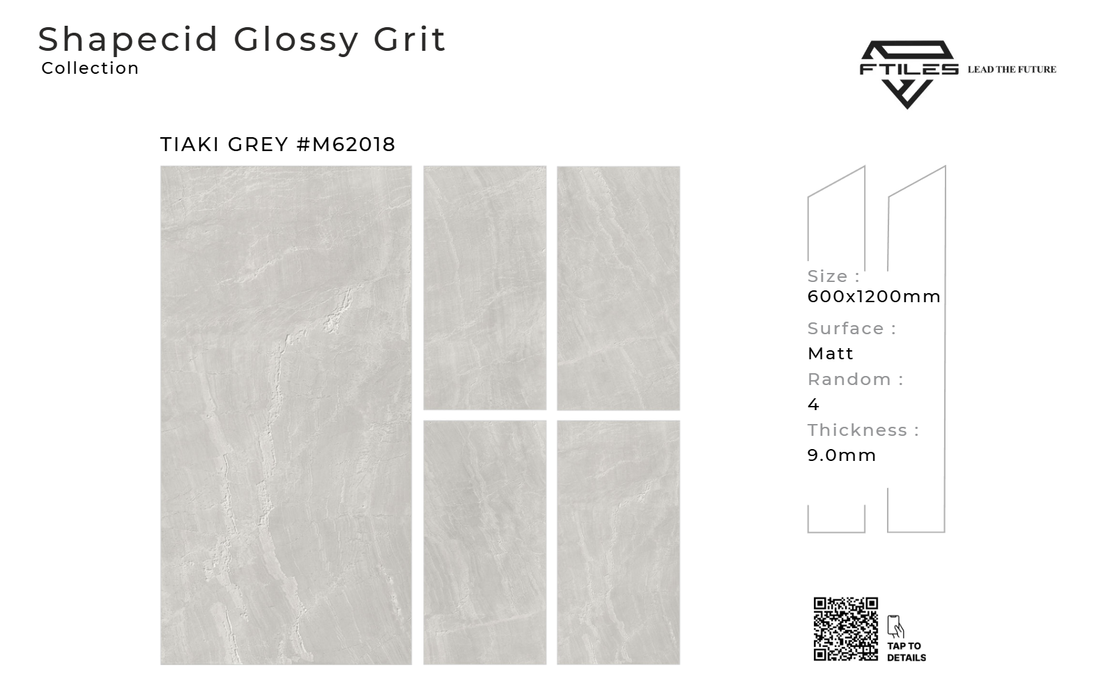 TIAKI GREY – M62018 là mẫu gạch Matt (mờ, chống trơn) cao cấp, kích thước 600x1200mm, nổi bật với gam xám trung tính hiện đại cùng vân đá granite tinh tế. Thiết kế mang đến sự thanh lịch – bền vững – an toàn, phù hợp cho không gian sống hiện đại và công trình thương mại cao cấp.