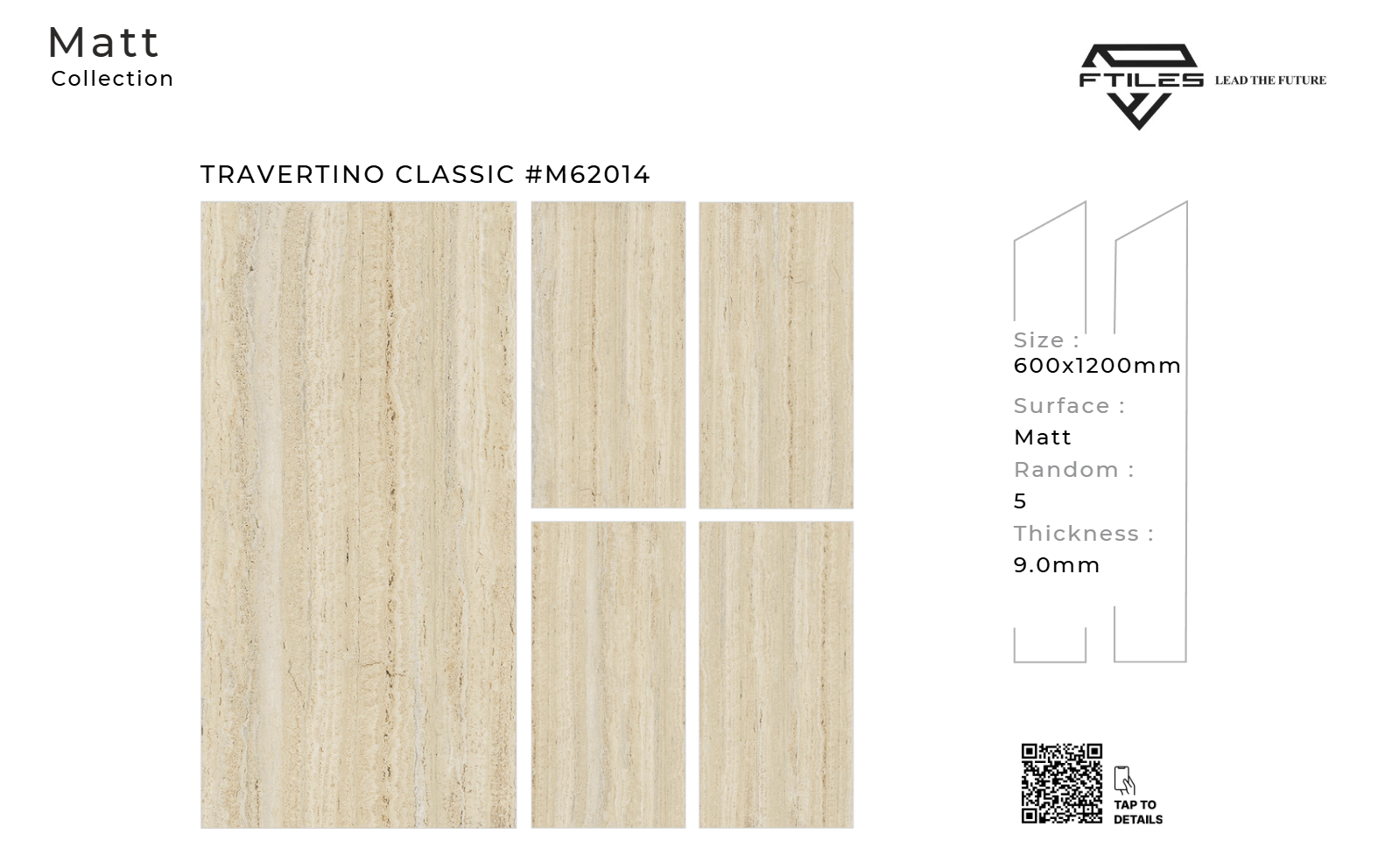 TRAVERTINO CLASSIC – M62014 là mẫu gạch Matt (mờ, chống trơn) cao cấp, kích thước 600x1200mm, mô phỏng vẻ đẹp tự nhiên của đá travertine cổ điển. Gam màu be kem nhã nhặn kết hợp vân đá tầng lớp tinh tế mang đến sự ấm áp – sang trọng – bền vững, lý tưởng cho không gian sống và công trình thương mại cao cấp.