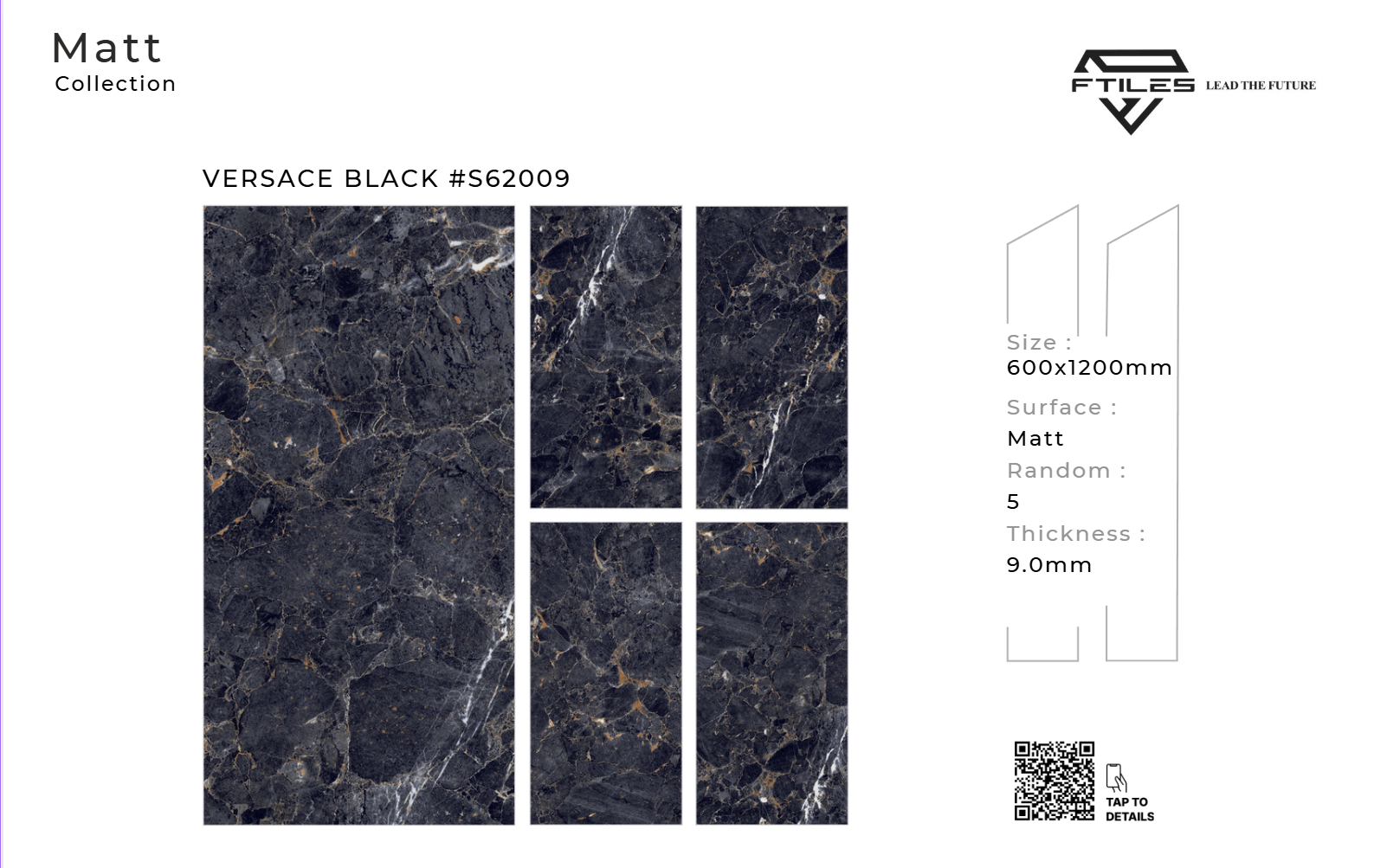 VERSACE BLACK – S62009 không chỉ là gạch lát/ốp, mà còn là tuyên ngôn về phong cách sống đẳng cấp. Với gam đen huyền bí, vân đá tinh tế, bề mặt Matt chống trơn và độ bền vượt trội, sản phẩm mang lại sự kết hợp hoàn hảo giữa thẩm mỹ – công năng – sang trọng, lý tưởng cho các công trình cao cấp.