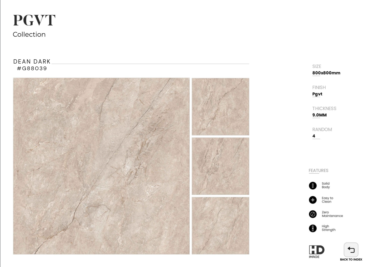 DEAN DARK – G88039 là dòng gạch PGVT (Polished Glazed Vitrified Tile) cao cấp của FTILES, mang đến giải pháp hoàn thiện sàn nhà sang trọng và bền bỉ. Với kích thước 800x800mm cùng bề mặt bóng kính cao cấp, sản phẩm tái hiện chân thực vẻ đẹp của đá marble xám đậm, vân đá mạnh mẽ và sắc nét, tạo nên sự uy nghi – hiện đại – đẳng cấp cho mọi công trình.