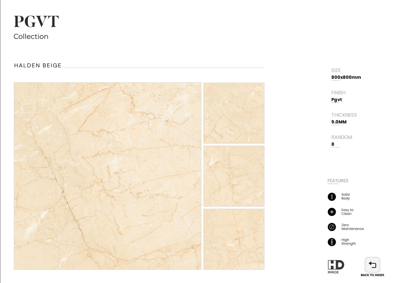 HALDEN BEIGE là mẫu gạch PGVT (Polished Glazed Vitrified Tile) bóng kính cao cấp của FTILES, kích thước 800x800mm. Với gam be sáng ấm áp cùng hiệu ứng vân đá marble tự nhiên mềm mại, bề mặt bóng kính mang đến sự sang trọng – thanh lịch – đẳng cấp, giúp không gian trở nên rộng mở và sáng thoáng.