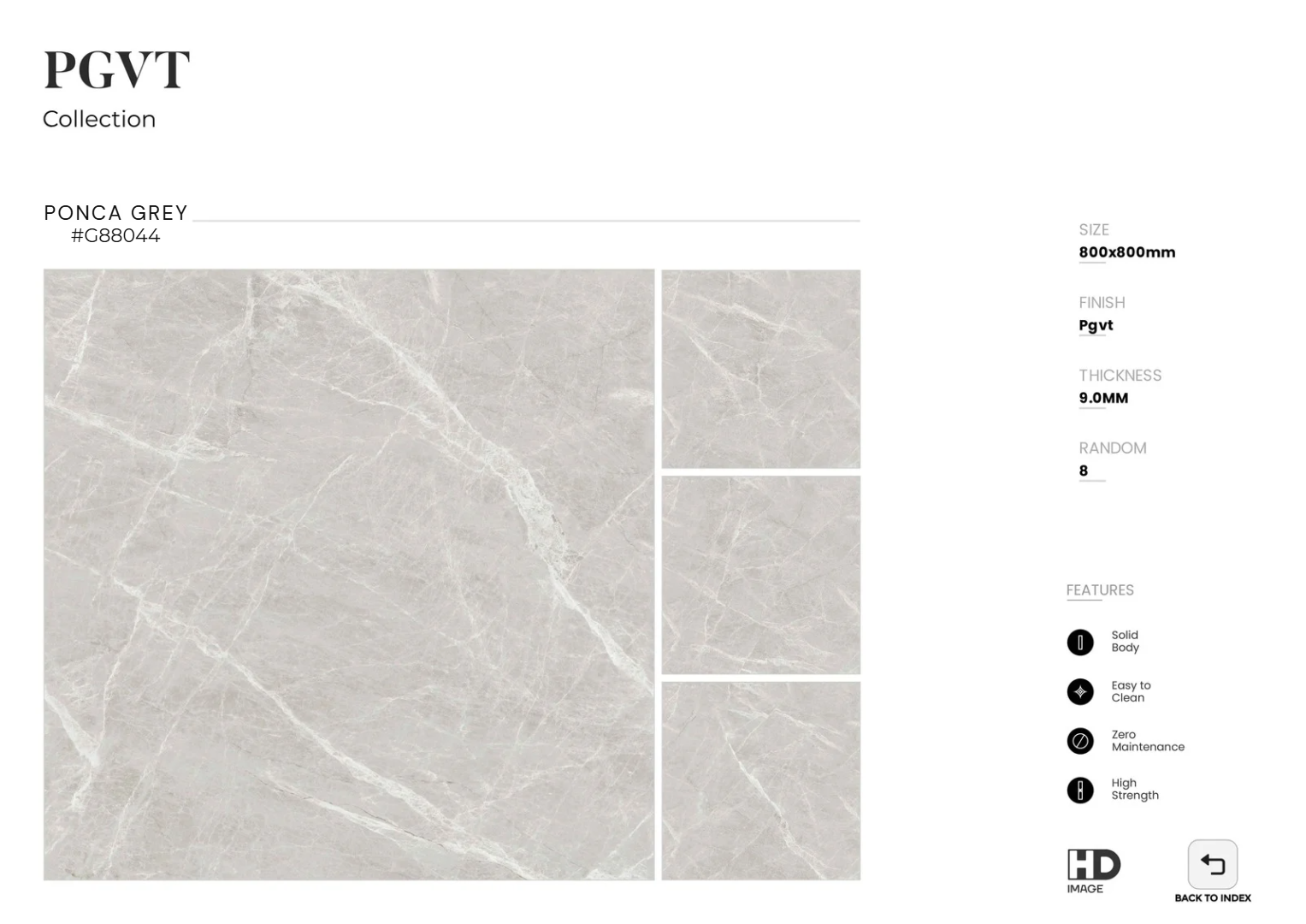 PONCA GREY – G88044 là mẫu gạch PGVT bóng kính cao cấp, kích thước 800x800mm, mang gam xám marble hiện đại với vân đá tự nhiên tinh tế. Bề mặt bóng kính giúp không gian trở nên sáng rộng – sang trọng – thanh lịch, tạo điểm nhấn thẩm mỹ nổi bật cho nhiều loại công trình.